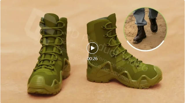 这个军靴3D视频,将作战、沙漠、战术、警用——四大实战场景模块化呈现。通过动态场景切换,清晰展示军靴在不同环境下的性能与适配性,让产品优势一目了然。