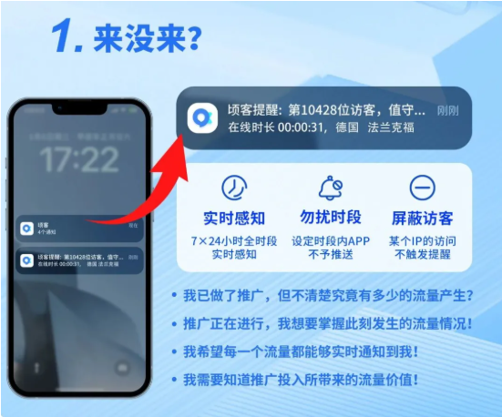 ● 实时感知访客动态:在线直接查看,离线及时提醒,第一时间掌握“谁来了”不错过任何一个潜在客户;