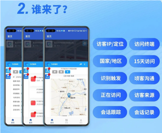 ● 全面洞察访客信息:IP定位、访问终端、来源渠道、历史行为等一目了然,精准识别意向客户;
