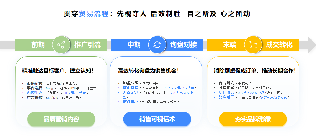 3D企业沙盘并不是单一的产品展示,而是贯穿“推广(流量)—询盘(留量)—成交(有效转化)”贸易全流程的数字营销工具产品。